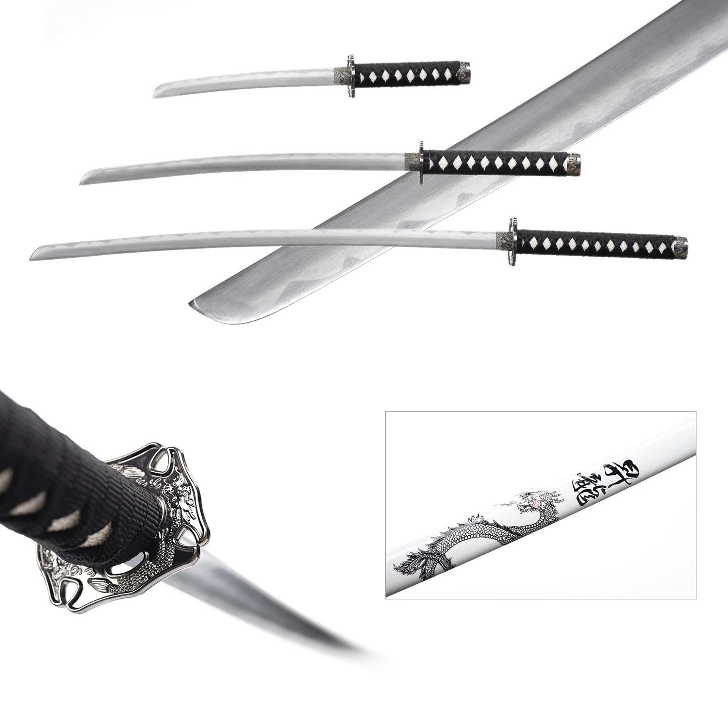 The white katana is characterized by its distinctive appearance: a curved, single-edged blade with a squared guard and long grip to accommodate two hands. The handles are wrapped which gives it a good grip to hold. The blade of sword is made up of high-quality carbon steel, therefore, enough in most of the cases to be used for cutting purposes efficiently (but not always recommended).