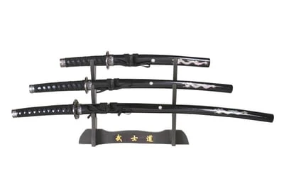 The sword set includes the Katana, Wakazashi, Tanto, Free Table Top Stand.