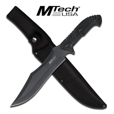 14 Inch overall in length 5MM Thick Black Stainless Steel Fixed Blade Knife Full Tang. Includes 1680D nylon sheath and lanyard.