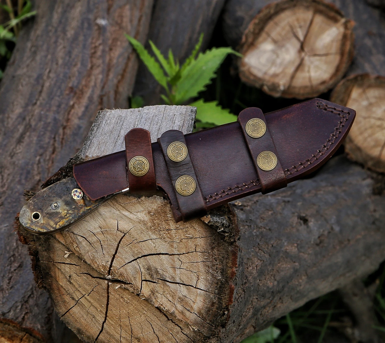 Our high-end Damascus Steel Custom Handmade Well-balanced Hunting Skinning Knife is hand-forged Damascus steel; pattern-welded in-house combining 1095 tool steel and 15N20 nickel tool steel. The hardness of this Damascus blade is rated at 55 to 58 HRC on the Rockwell scale which holds the sharpness for a long time. This hand-ground blade has heft and comfortable handling made for practical use. A genuine leather sheath is included. It has been hand sewn and stained. This sheath has belt loop so you can take this knife along when you are on the go!