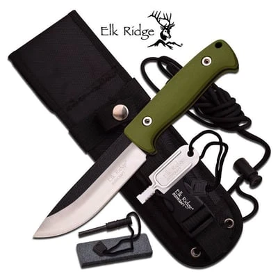 Elk Ridge BushCraft 10.5 Inch Fixed Blade Hunting Knife Olive Green Nylon Fiber Handle