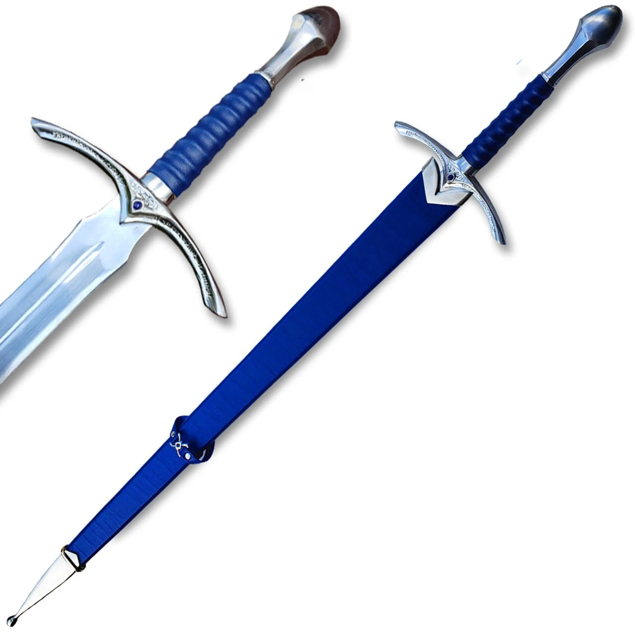 This is a very beautiful replica of the LOTR Fantasy Sword with Blue leather handle. This sword is full tang with a solid metal cross-guard. The wood scabbard is elegantly finished with silver and gold accents.