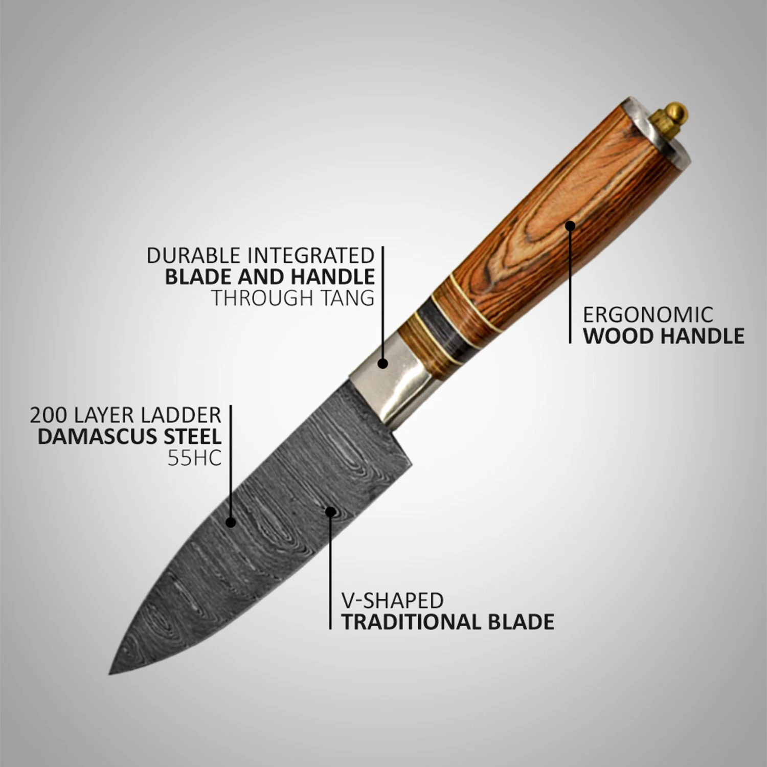 Custom handmade damascus steel chef set of five pieces. A masterpiece chef knives with Razor Sharp Cutting Edge. Our high-end damascus steel custom handmade well-balanced Chef knife is hand-forged 200 layer ladder damascus steel. The hardness of this Damascus blade is rated at 55 to 58 HRC on the Rockwell scale which holds the sharpness for a long time. A leather roll sheath is included.