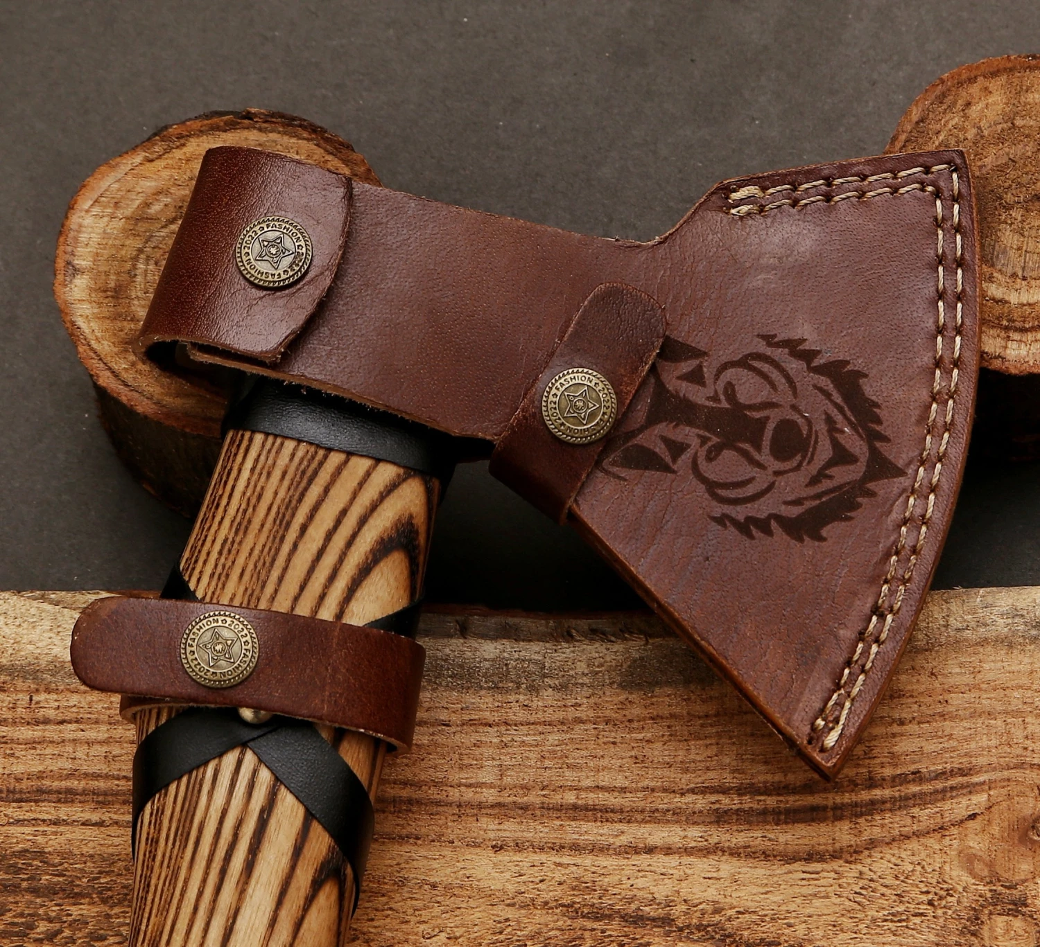Vegvisir Viking Axe Symbol Etched on Viking Axe. The Vegvisir Viking axe was a very common tool or weapon in Viking History. Everyone owned a Viking axe that could be used as a dangerous weapon in Battle. All axes were designed specifically for war. Complete with leather wrapped in ash wood handle. This axe is well balanced and ready for hard work; however, you may be more enticed to hang it on your wall for some awesome home décor. Comes complete with a complimentary sheath made from quality genuine rich brown leather, and has snap closures as well as a belt loop for hands-free carry.