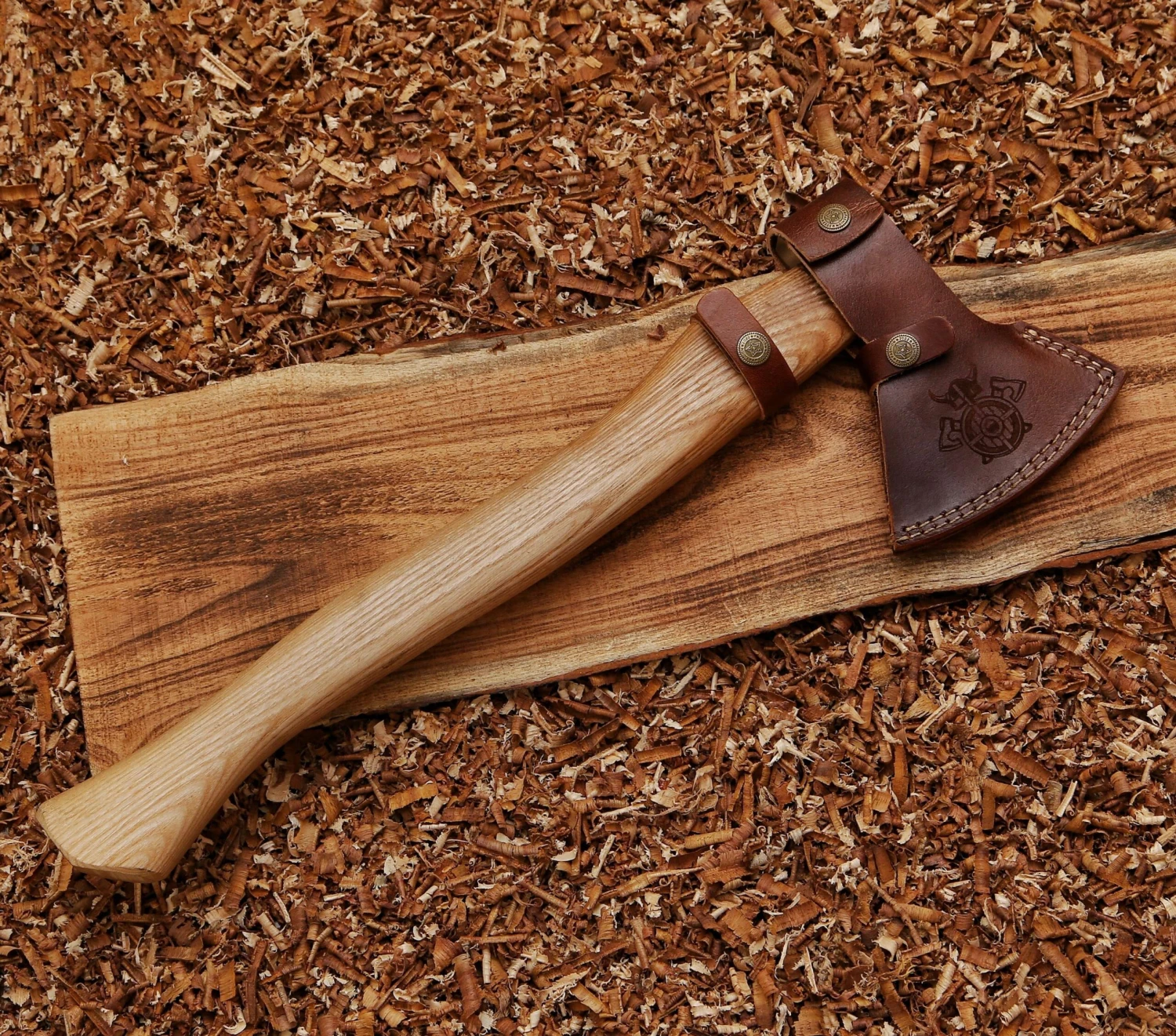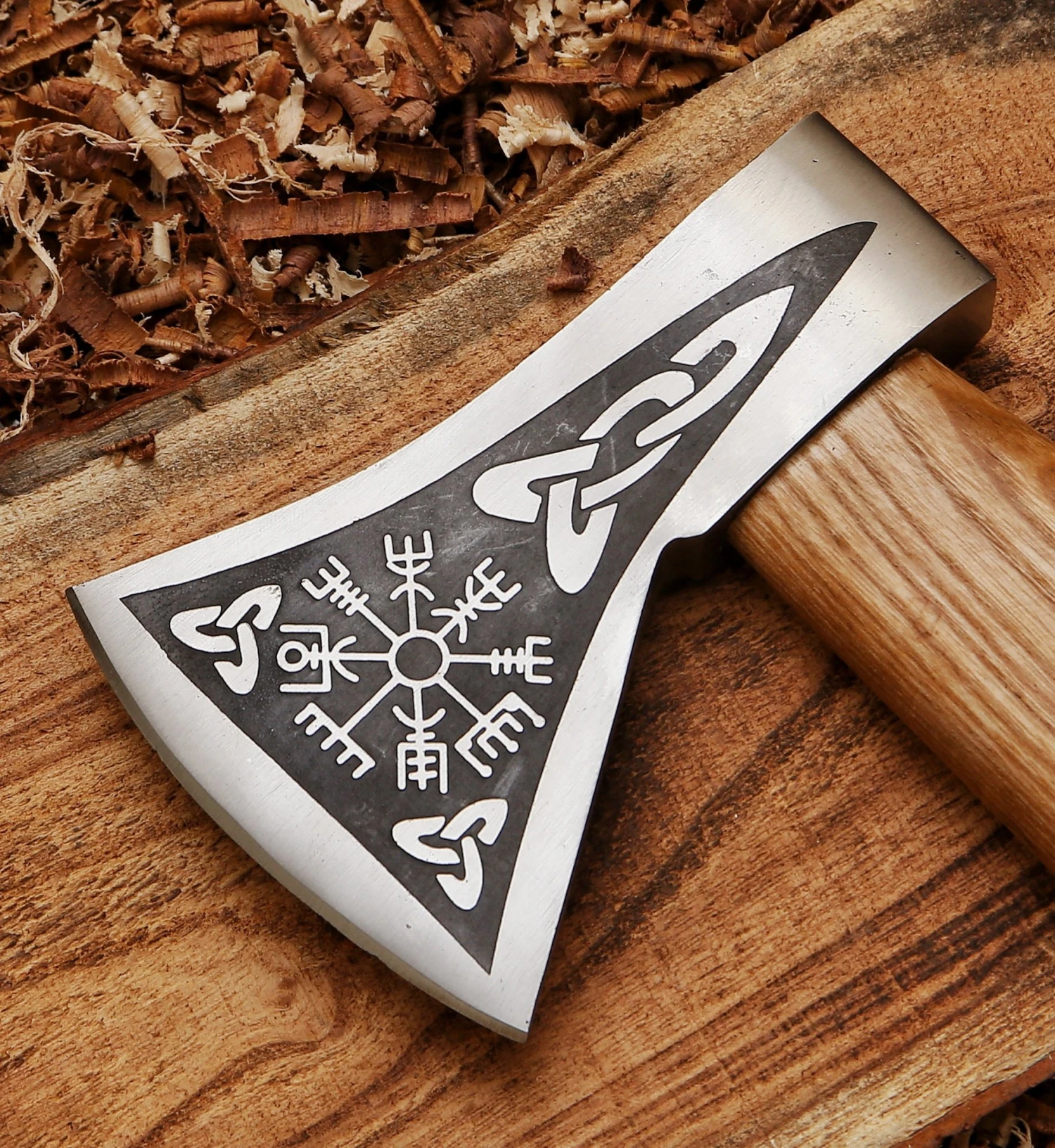 Vegvisir Viking Axe Symbol Etched on Viking Axe, itβs also called Camping Hatchet due to its design and uses. The Vegvisir Viking axe was a very common tool or weapon in Viking History.Β Everyone owned a Viking axe that could be used as a dangerous weapon in Battle. All axes were designed specifically for war. Comes complete with a complimentary sheath made from quality genuine leather, and has snap closures as well as a belt loop for hands-free carry.